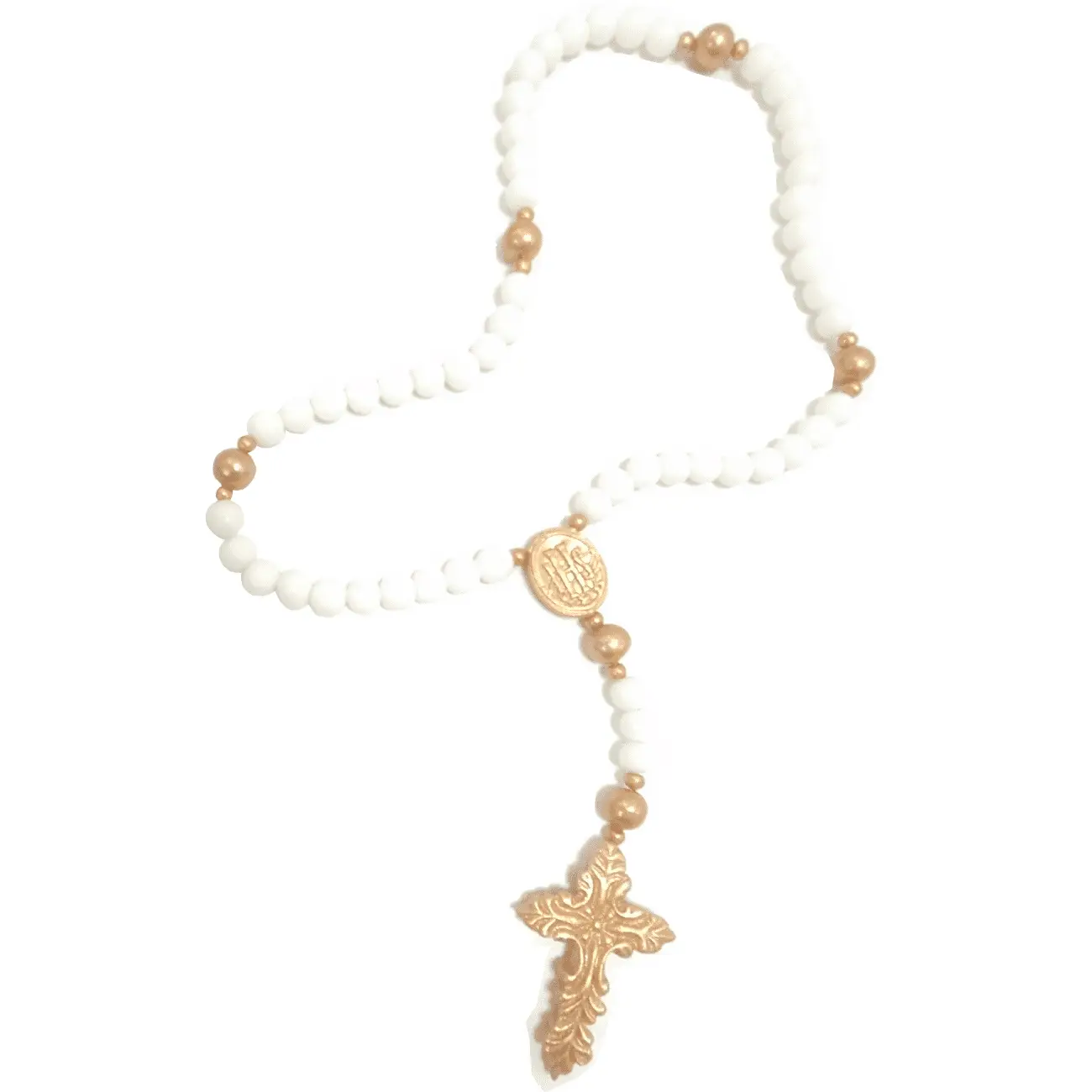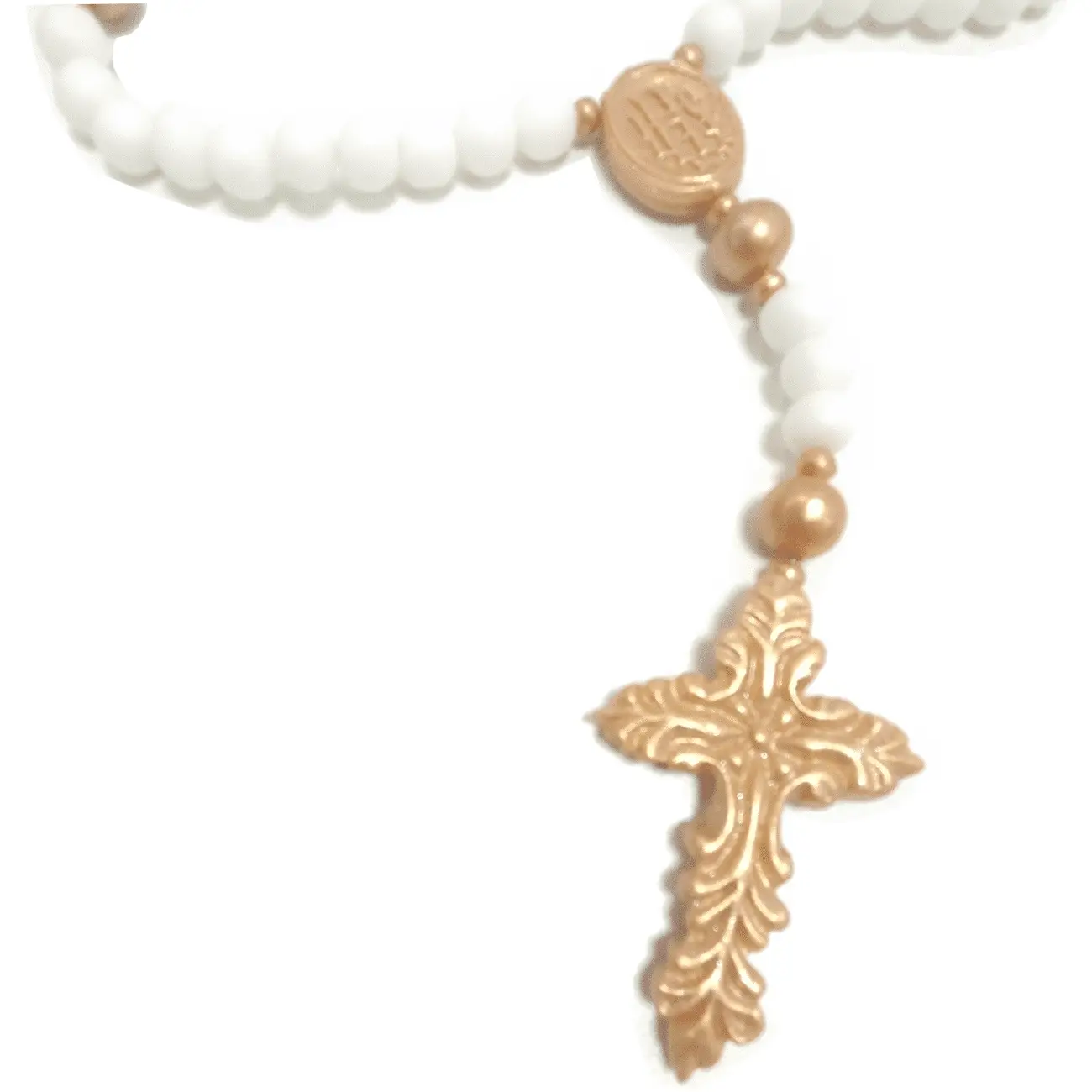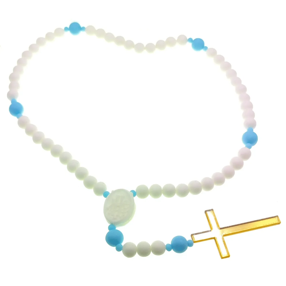 Unikalną cechą naszego różańca jest elastyczne połączenie paciorków, które umożliwia łatwe modelowanie i układanie go w dowolny kształt. Dzięki tej funkcji, nasz różaniec można swobodnie ułożyć na torcie lub nawet zawiesić, tworząc efektowną i niepowtarzalną dekorację. Złoty krzyż i medalik z wizerunkiem świętego są nie tylko piękne, ale i dodają głębi każdej uroczystości, stając się symboliczną pamiątką dla obdarowanego.